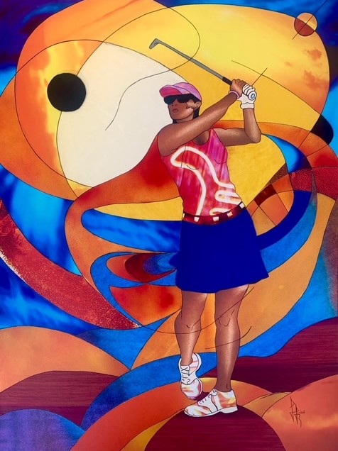 Titre : Élan Solaire – Collage abstrait contemporain inspiré du golf Description : “Élan Solaire” est une œuvre originale de Gil Loison qui explore le mouvement, l’énergie et la fluidité du geste sportif à travers une approche abstraite et colorée. Inspirée du swing de golf, cette peinture met en scène un personnage en pleine action, intégré dans une composition dynamique faite de courbes, de spirales et de superpositions de couleurs. Les tons chauds (jaune, orange, rouge) traduisent la puissance et l’intensité du geste, tandis que les nuances de bleu apportent équilibre et profondeur. Les formes en premier plan, évoquant des collines stylisées, renforcent la perspective et ancrent l’œuvre dans un univers à la fois réel et poétique. L’ensemble crée une sensation de mouvement continu, où le regard circule librement à travers la toile. Caractéristiques : * Technique : technique mixte sur support * Format : 60 x 80 cm * Artiste : Gil Loison * Œuvre originale signée Cette œuvre s’inscrit dans une démarche artistique autour du mouvement, de l’énergie et de la représentation du geste sportif. Elle trouvera parfaitement sa place dans un intérieur contemporain ou dans un espace lié à l’univers du golf (club-house, bureau, espace de réception). Disponible à la vente – Pour toute demande, merci de me contacter.